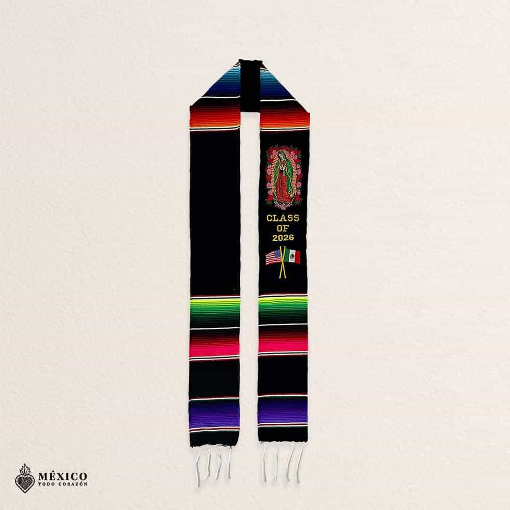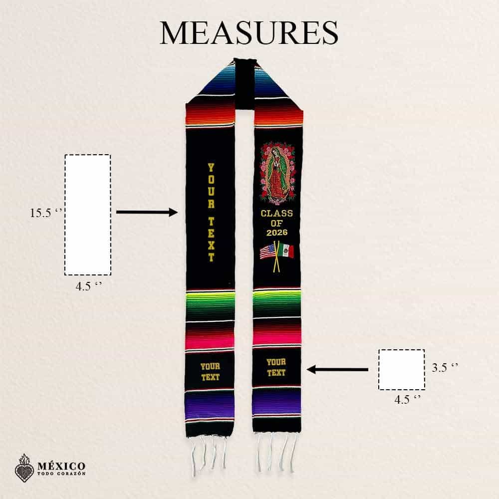 Celebrate your milestone with this embroidered Mexican Graduation Stole, made with traditional sarape fabric and detailed stitching that reflects the richness of Mexican heritage. Designed for versatility, the artwork can be worn on either side left or right, allowing each graduate to customize their look with cultural pride.