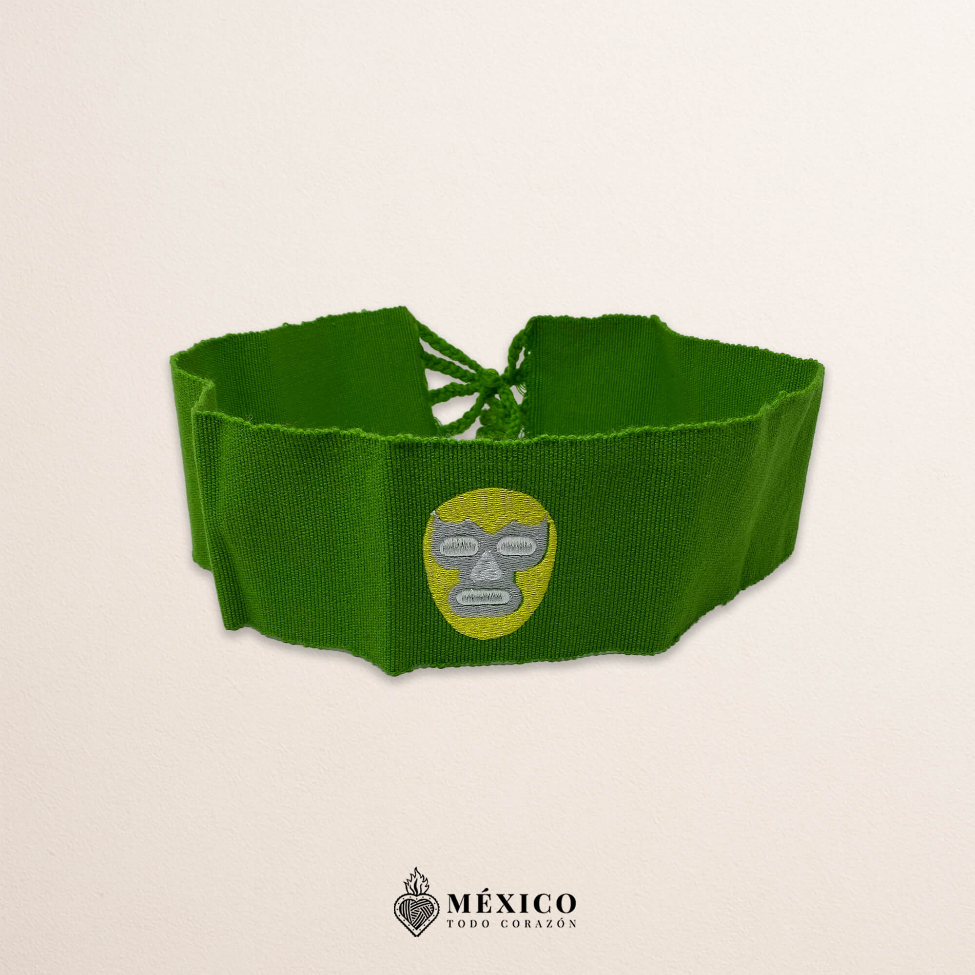 Handcrafted green faja Mexican waist belt featuring an embroidered luchador mask designHandcrafted Luchador Mask Embroidered Mexican Waist Belt – Premium Green Faja