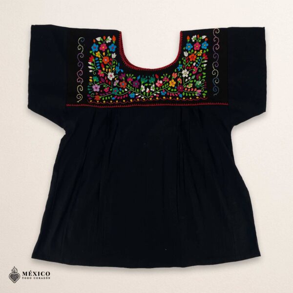 Celebrate authentic Mexican artistry with this beautifully embroidered traditional blouse. Handcrafted by skilled artisans, it features vibrant multicolor Otomi-style motifs including flowers, birds, and animals, stitched entirely by hand over soft fabric. The upper panel and vertical embroidered bands create a classic silhouette with cultural charm and everyday versatility.