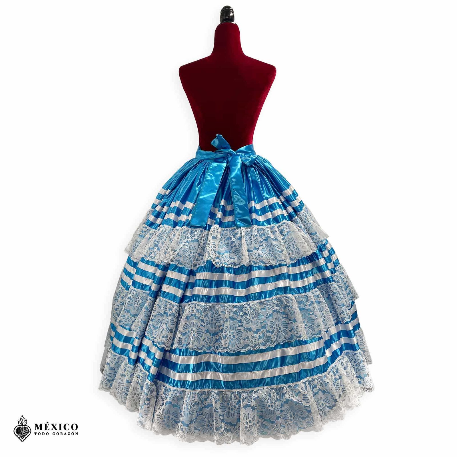 Crafted from satin polyester (raso satinado), the fabric offers a soft sheen that enhances stage presence while remaining lightweight and comfortable. The double-layered flare adds dramatic fullness, while delicate lace trim brings a refined traditional touch.