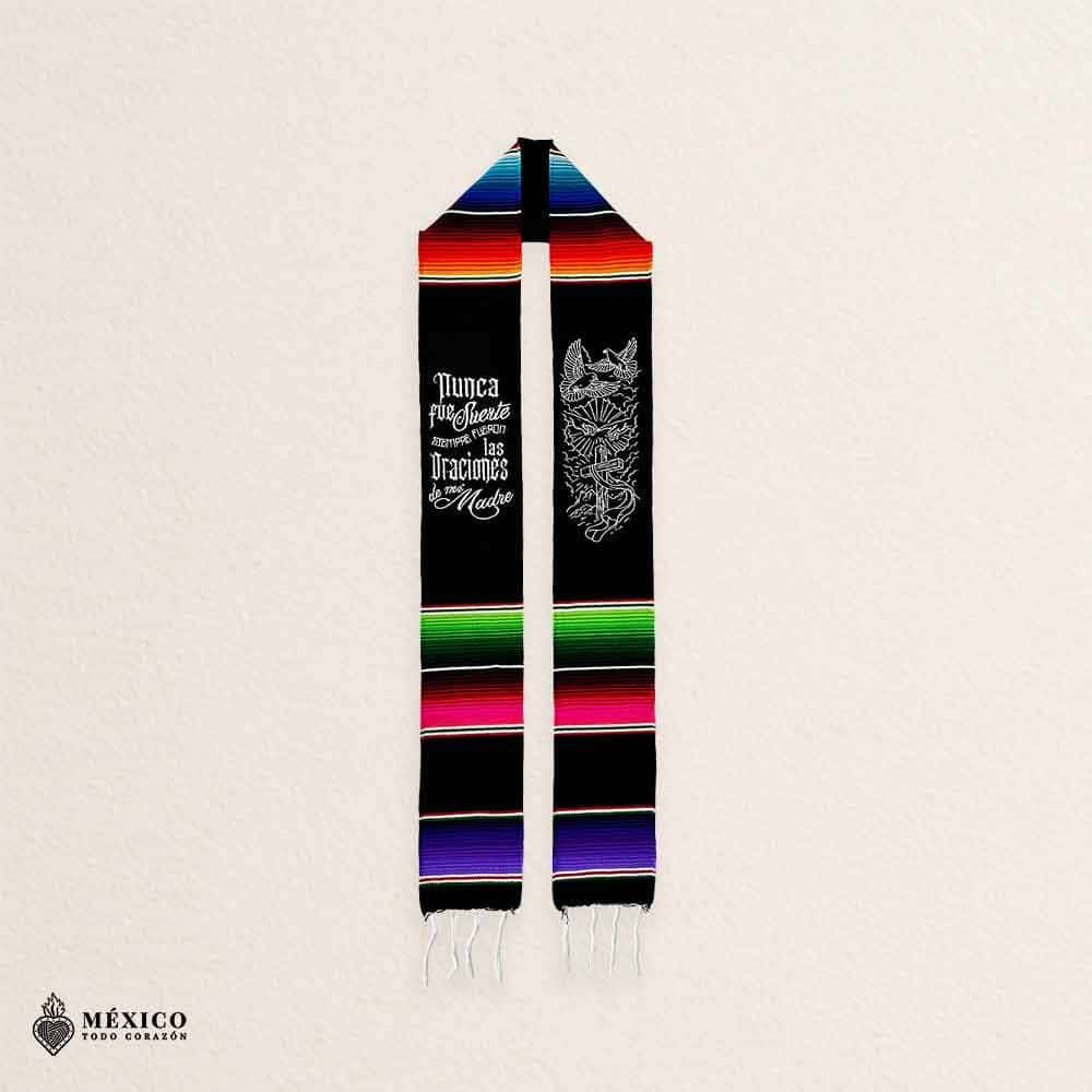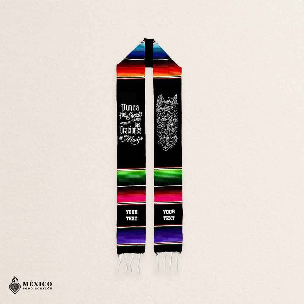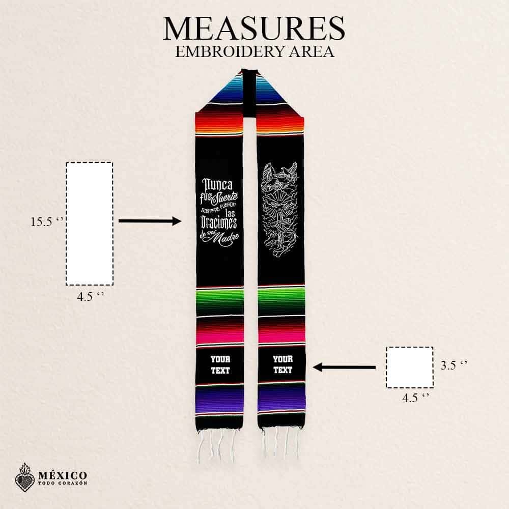 Honor your journey with faith, family, and orgullo Mexicano. This Black Mexican Graduation Stole features the powerful phrase “Nunca fue suerte, siempre fueron las oraciones de mi Madre”, a tribute to the strength of mamá and the sacrifices behind every achievement.