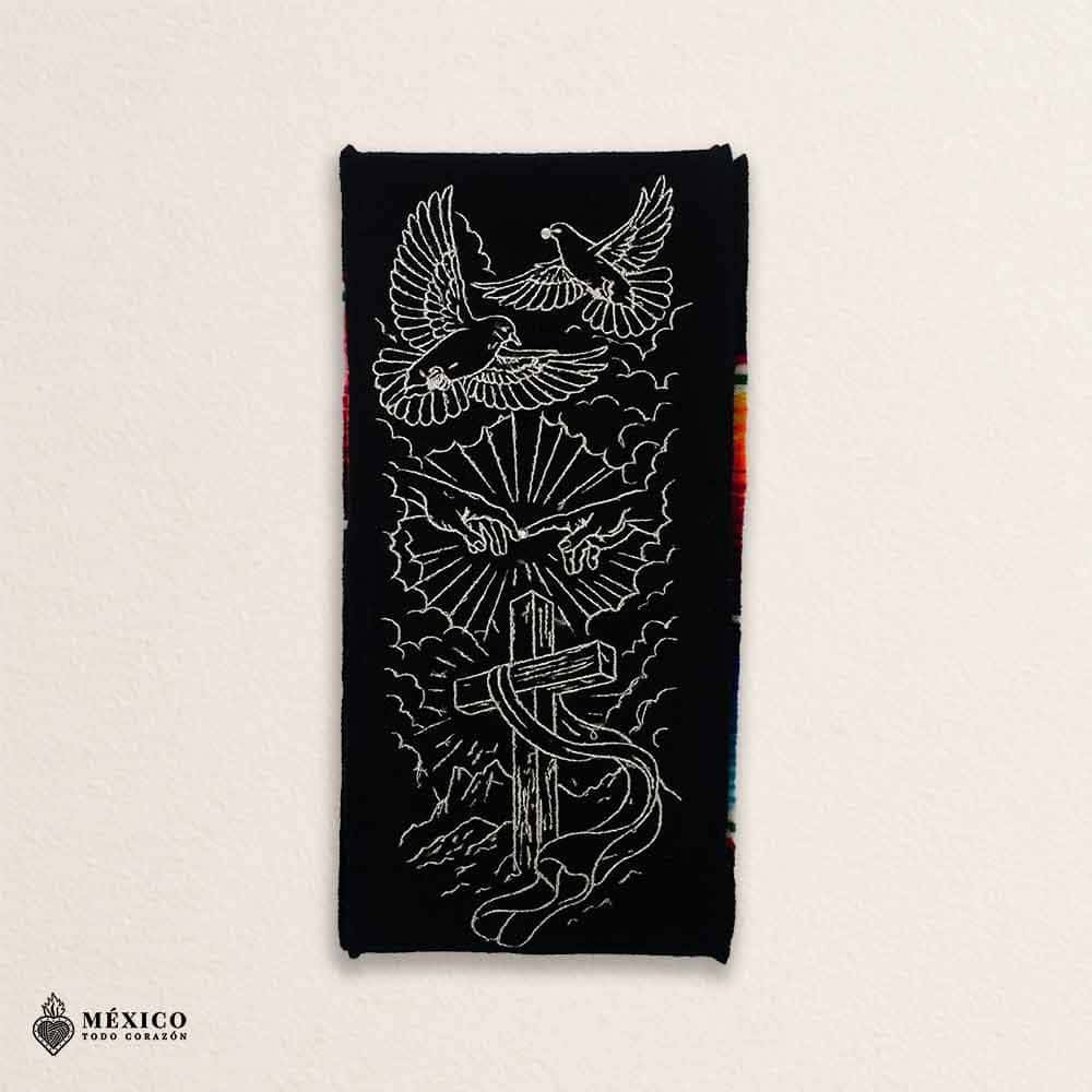 Designed in bold white lettering over a classic black background, the stole also showcases a detailed religious embroidery design with a cross, praying hands, radiant light, and doves in flight, symbolizing faith, protection, and gratitude. A meaningful piece for Latino, Chicano, pocho, and Mexican-American graduates celebrating their cultura and raíces.