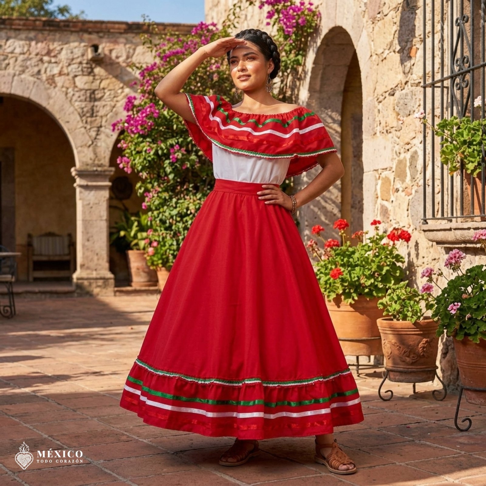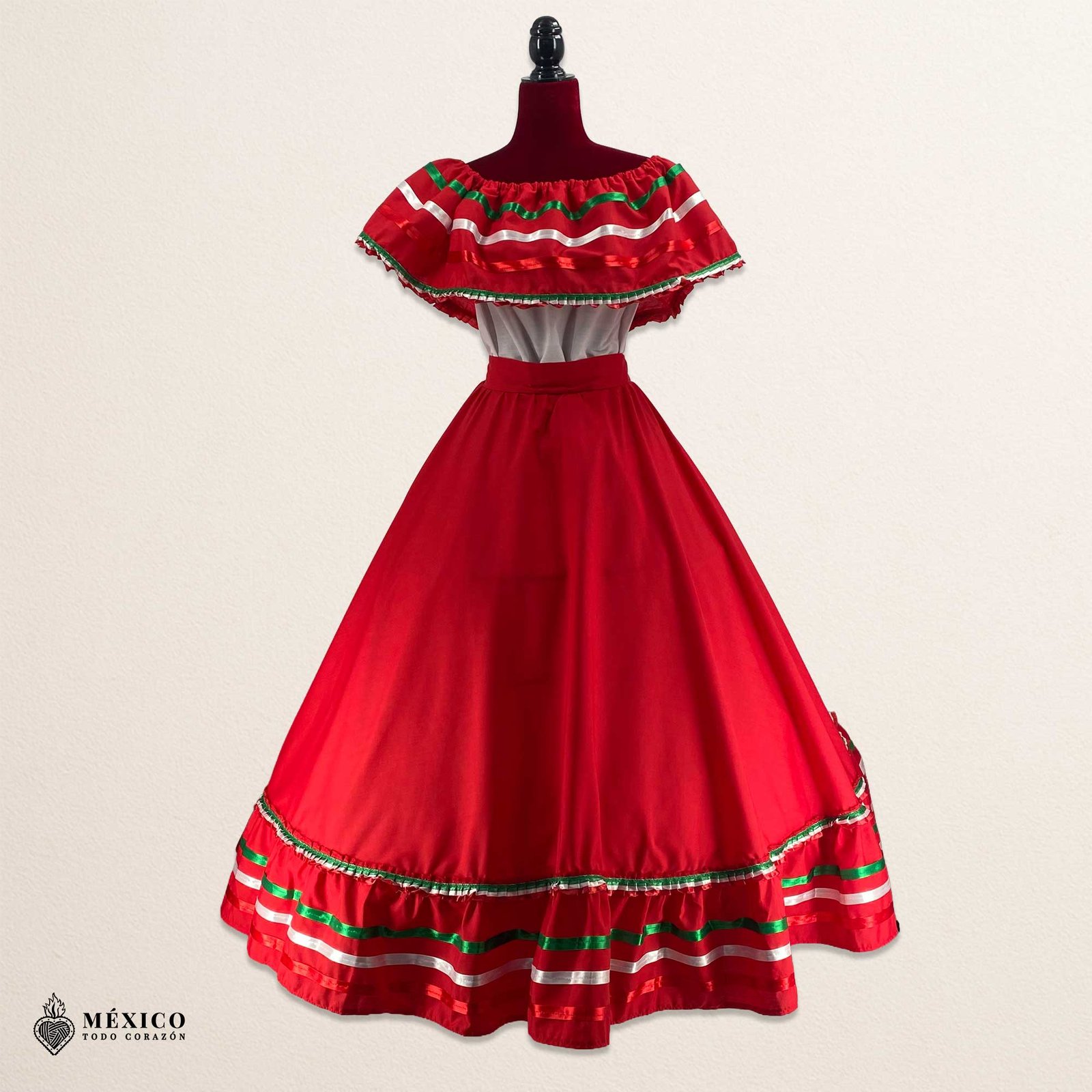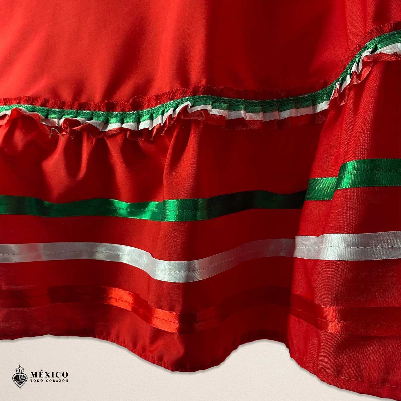 Celebrate Mexican heritage with this handmade traditional Mexican dress set, featuring a vibrant red skirt accented with tricolor ribbon details (green, white, and red) and a matching blouse. This two-piece outfit reflects authentic Mexican craftsmanship and timeless cultural style.