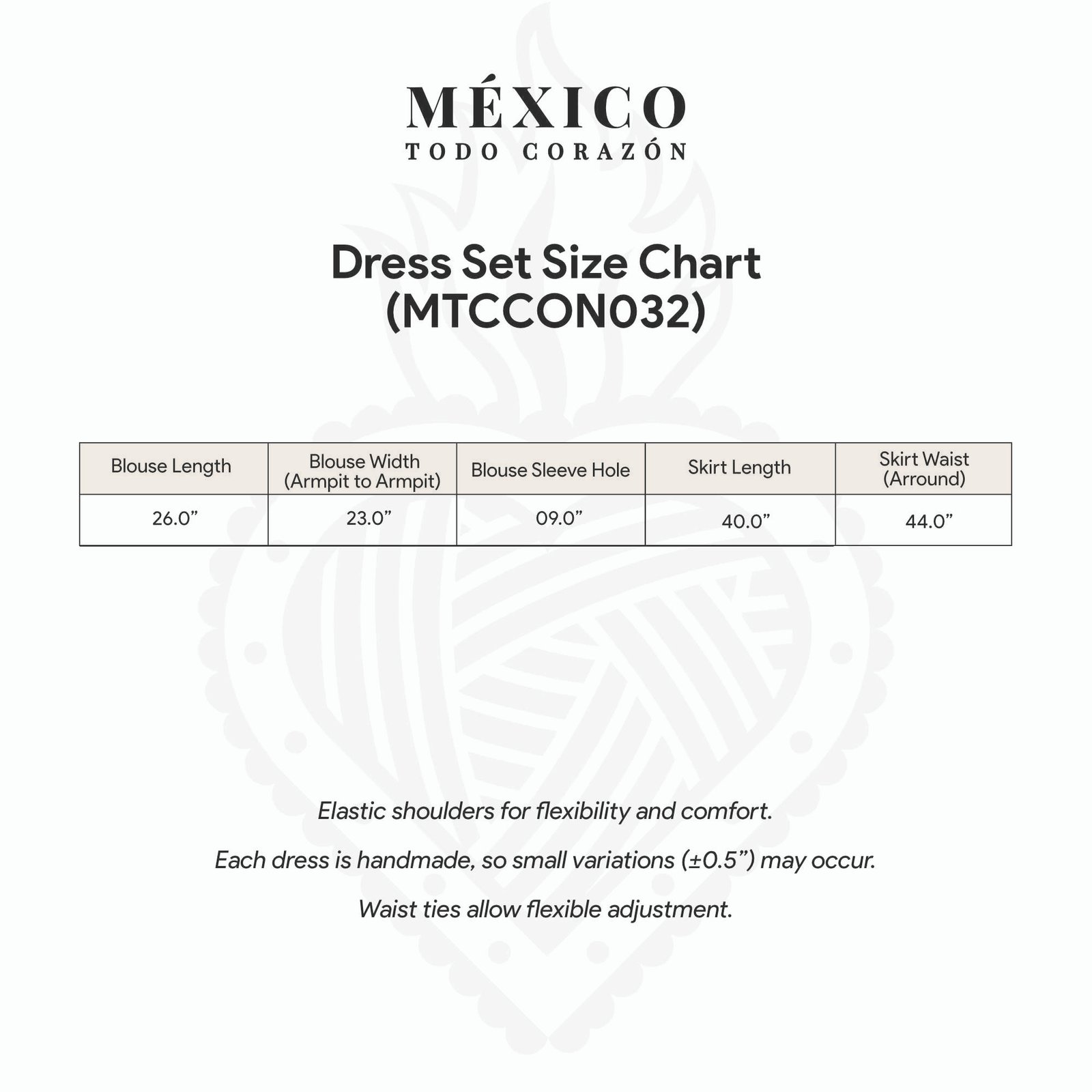 The skirt has a, single-layer flow (Vuelo sencillo) and includes adjustable traditional ties, allowing a flexible and comfortable fit across different waist sizes. The blouse offers a relaxed silhouette designed to fit most body types. For presentation and fullness, the skirt is styled with a traditional undergarment underneath (not included).