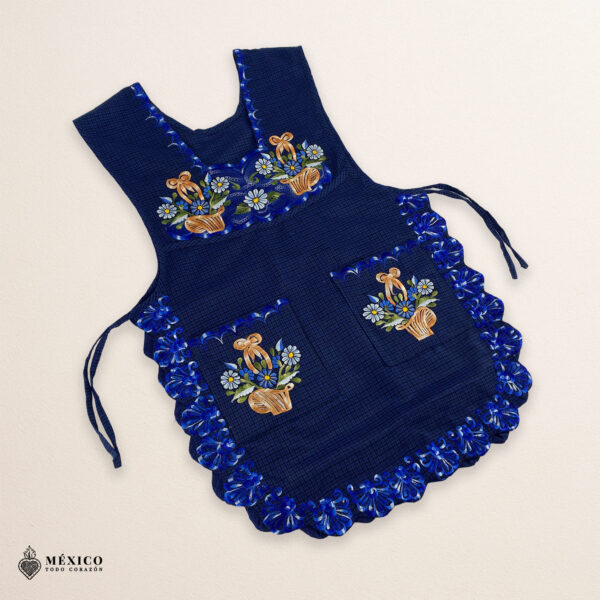 Royal Blue Mexican Embroidered Smock Apron – Floral Traditional Design for Woman