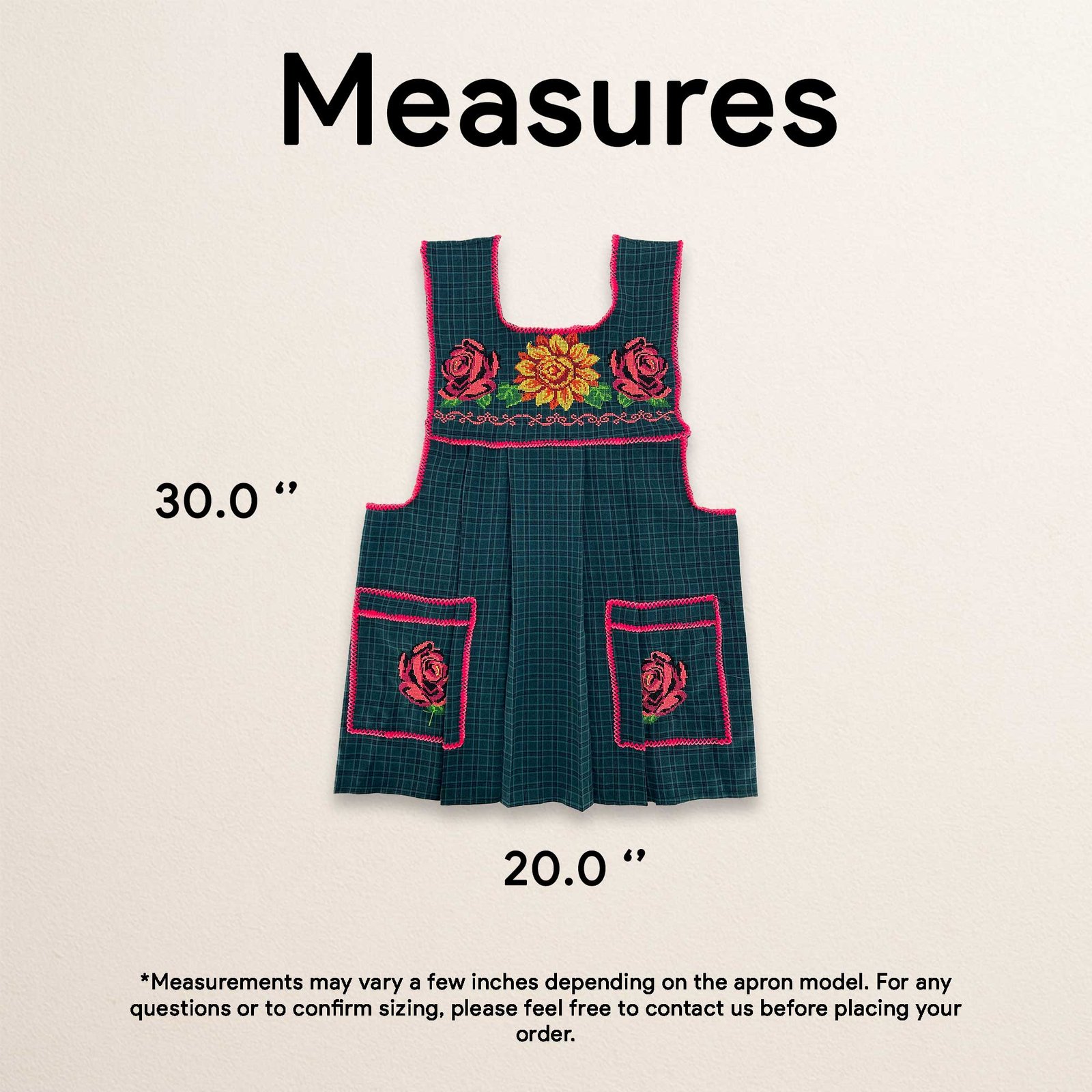 Due to its handcrafted nature, slight variations in embroidery, stitching, and measurements may occur, making each apron a unique piece.