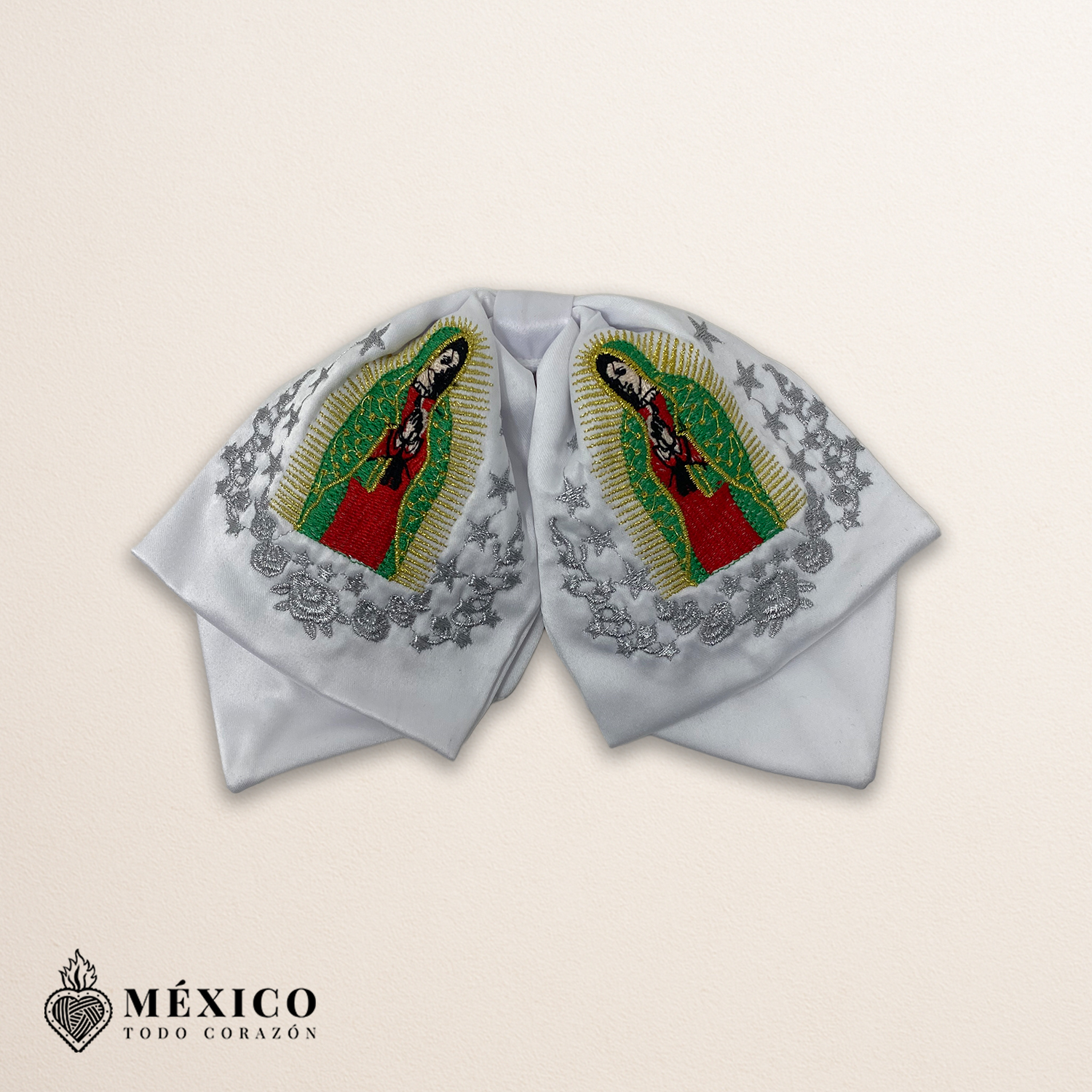 White Mexican Moño with Virgen de Guadalupe Embroidery | Traditional Mariachi Bow Tie