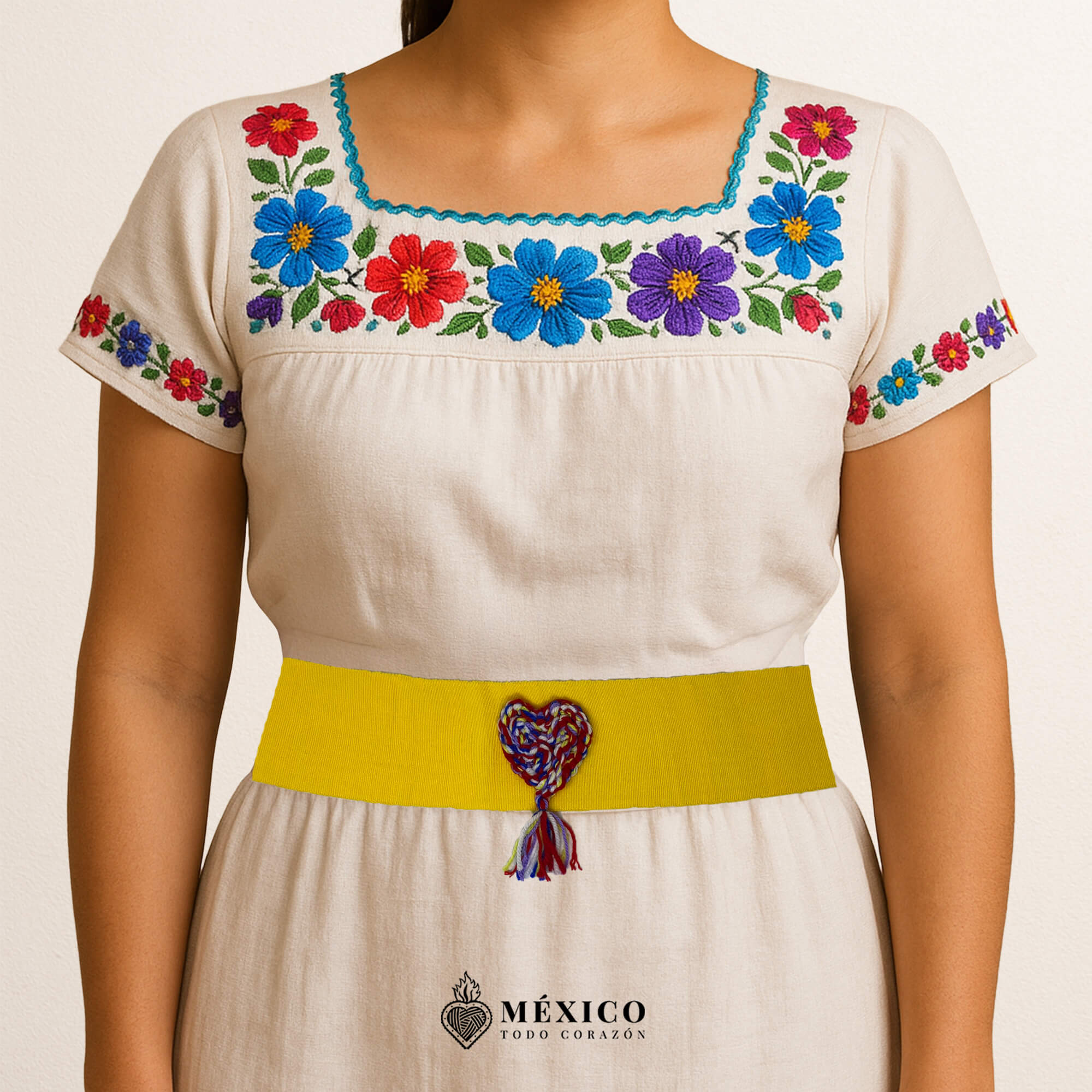 Yellow Artisan Mexican Waist Belt – Multicolor Yarn Heart EmbellishmenYellow Artisan Mexican Waist Belt – Multicolor Yarn Heart Embellishmen